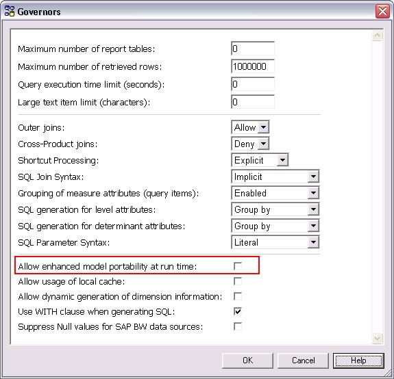 Ist diese Governors Einstellung aktiviert, so erzwingt Cognos das Auslesen der Metadaten aus der Datebank anstatt die Metadaten aus dem Framework Modell zu verwenden. Dies kann einen erheblichen (negativen) Einfluß auf die Abfrage-Performance haben. In der Regel sollte diese deaktiviert sein.